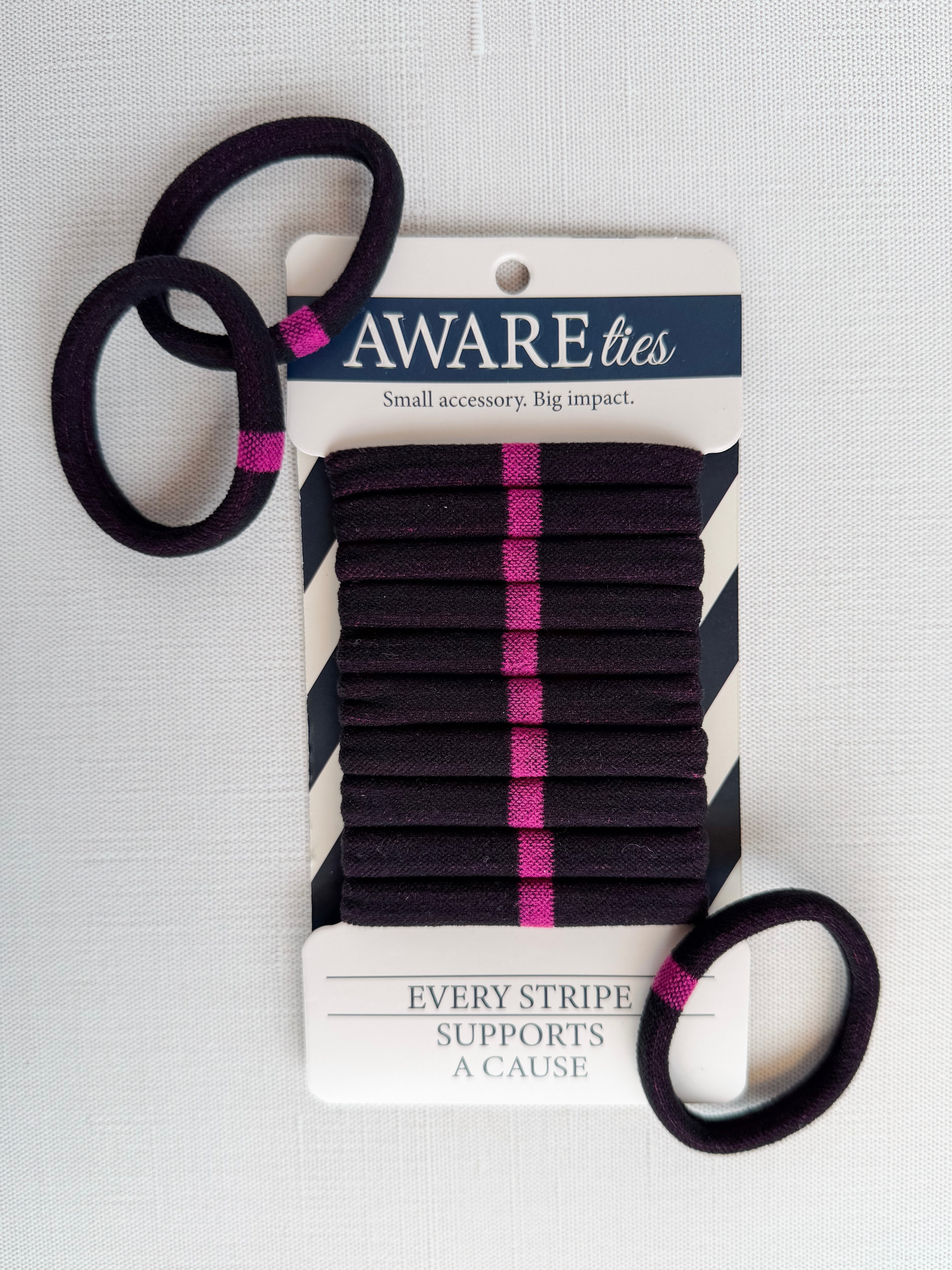 Show your support and spread awareness with the Pink Stripe AWAREties — our signature nylon hair ties designed to give back while holding strong. Each pack includes ten durable, no-snag ties that keep your hair secure all day without pulling, breaking, or stretching out.